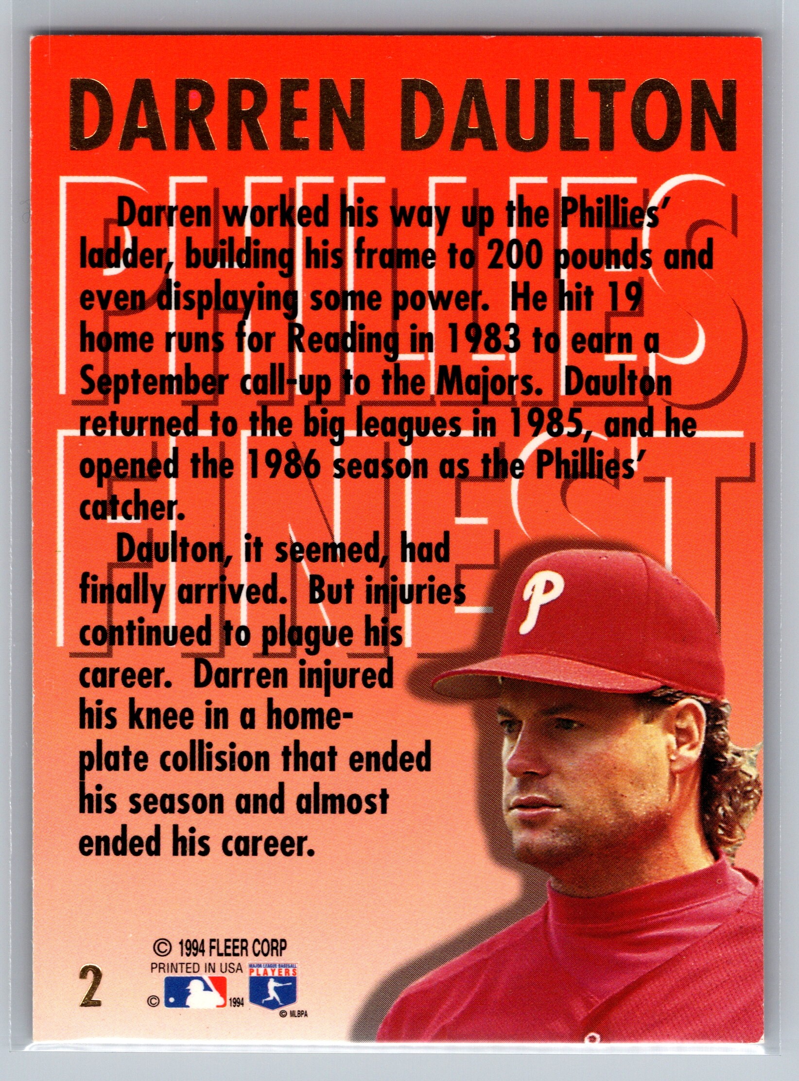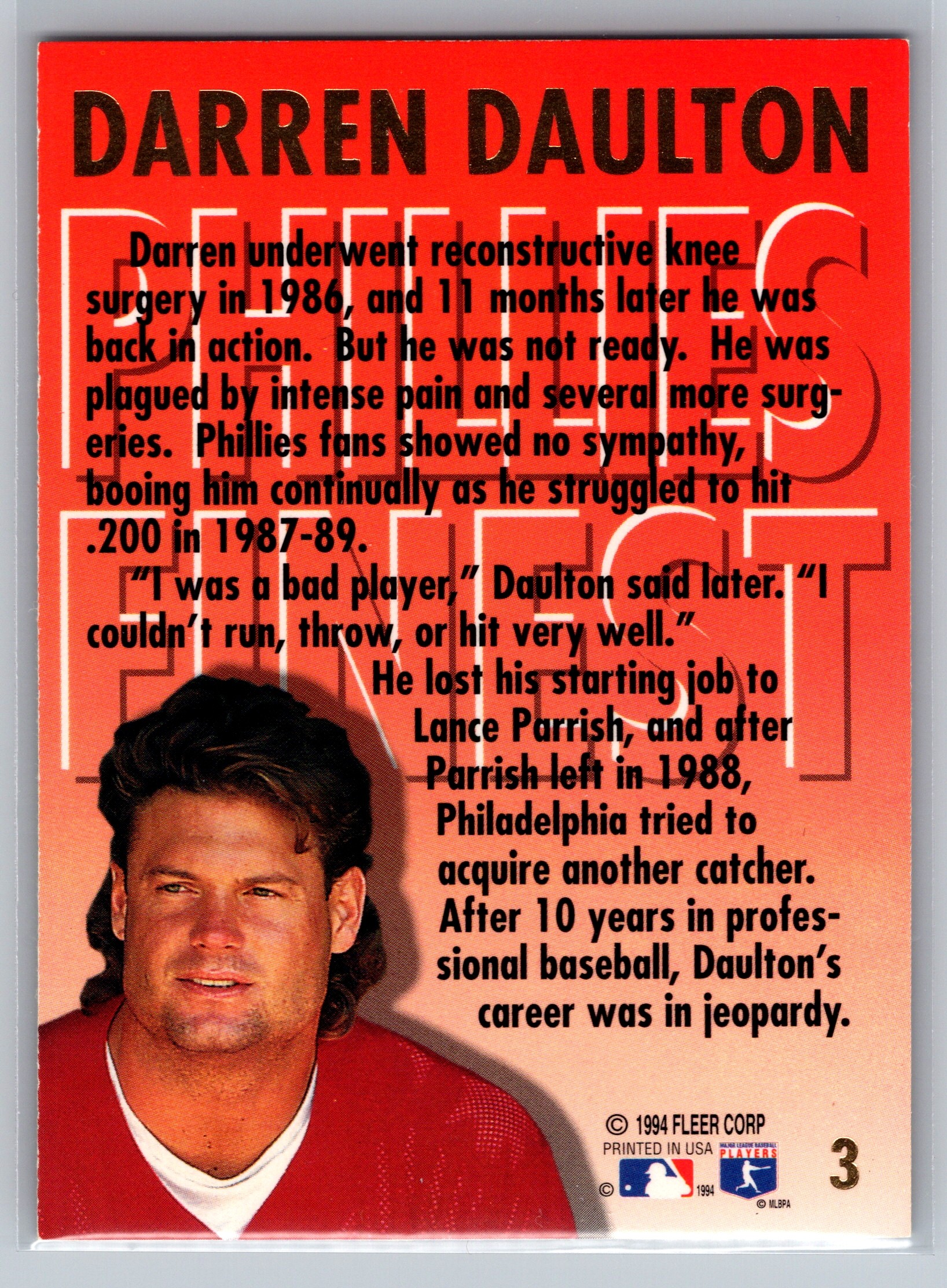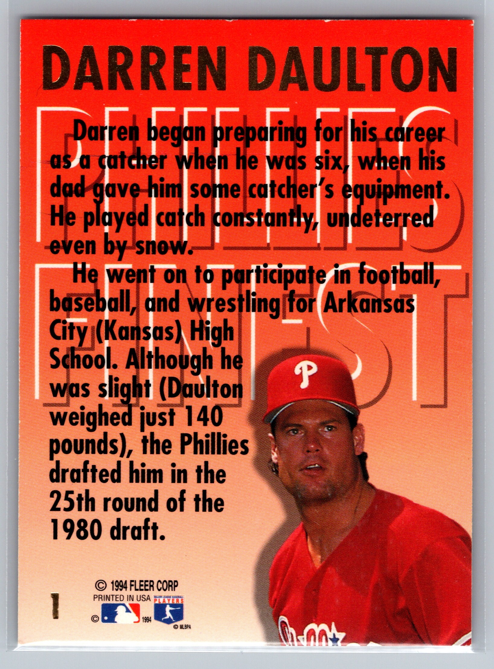 The backs of these cards paint a picture of who Darren Daulton is. I was astonished about the number of surgeries in card #5, and the story told here is a time capsule back to Veterans Stadium. My youth was spent in the 700 level in the few games we could get to, courtesy of the Hatfield hot dog tickets, where tickets vouchers were inside a 5lb package of hot dogs. We’d save those and the entire extended family would go into the yellow seats at the highest levels of the stadium. Those were glorious times, most of the time the team lost, or we got to the game and the Phillies were already out of contention.