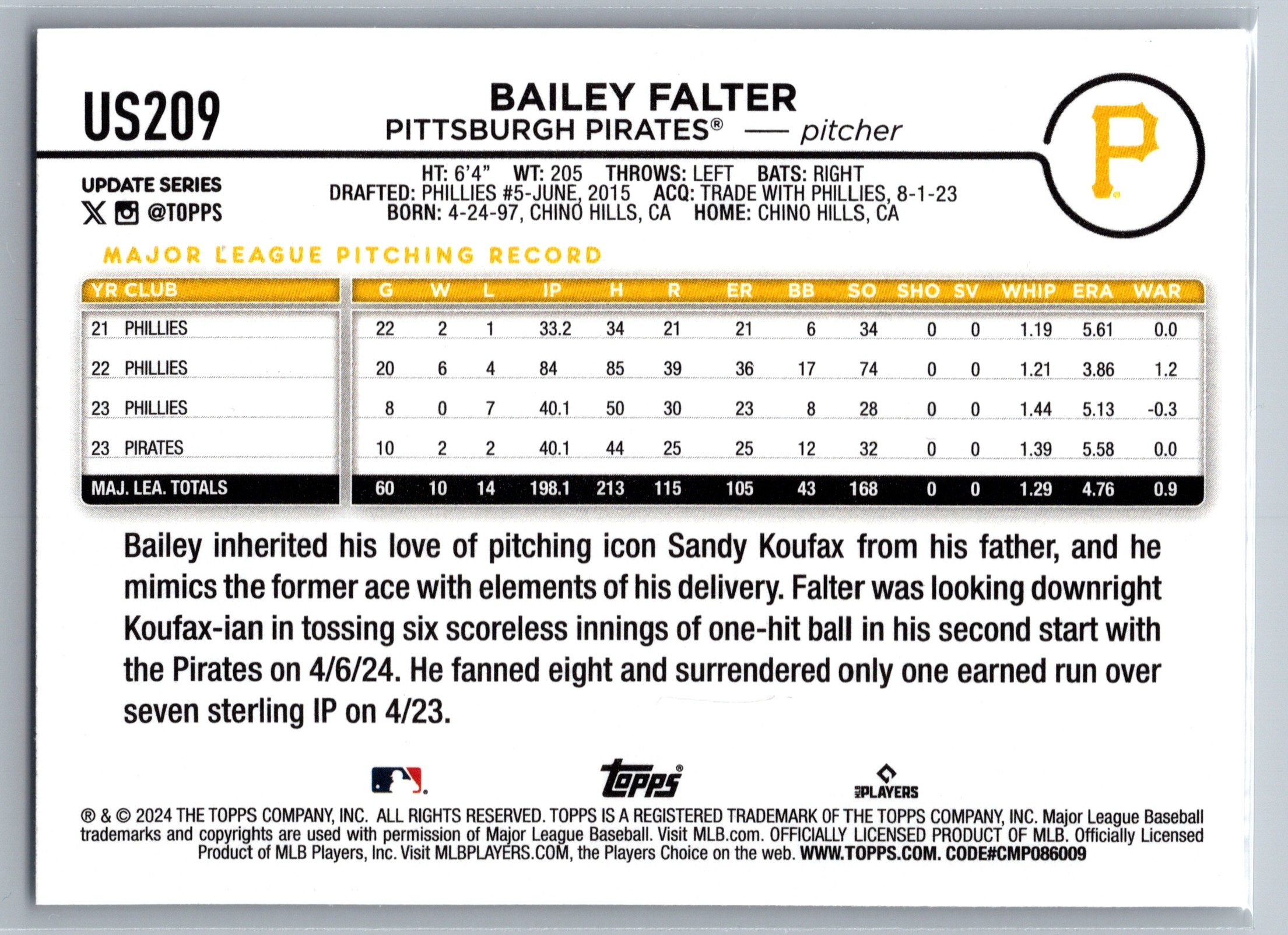 Bailey Falter was drafted in 2015 in the 5th round of the Amateur Draft, made his Phillies debut in 2021 on April 25th in the 8th inning against the Colorado Rockies in a lopsided 12-2 loss wearing number 70. He played for the Phillies from 2021 – 2023, and was knocked out of the first inning of the NLCS Game 4 vs the Padres, where he didn’t last 1 inning.