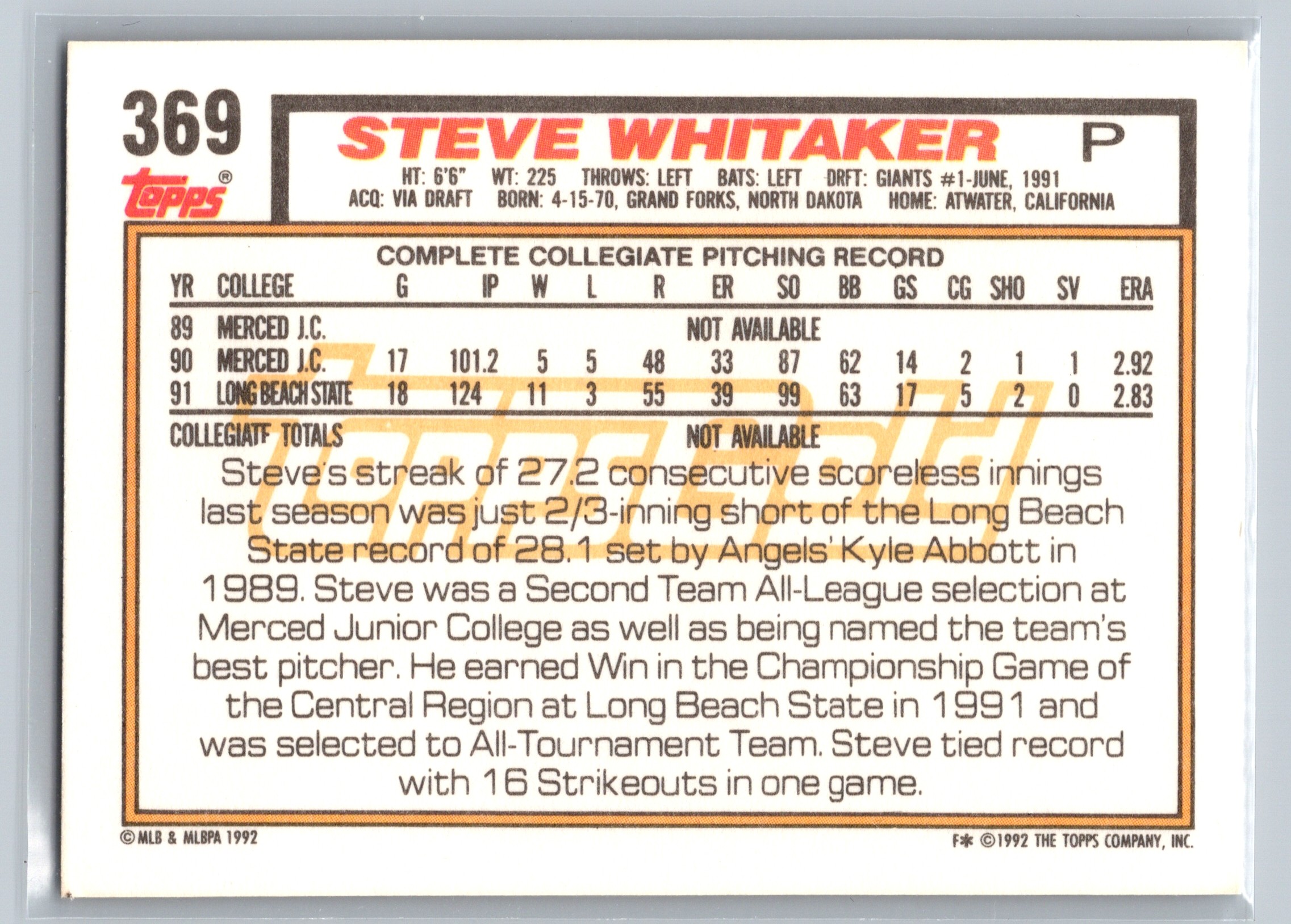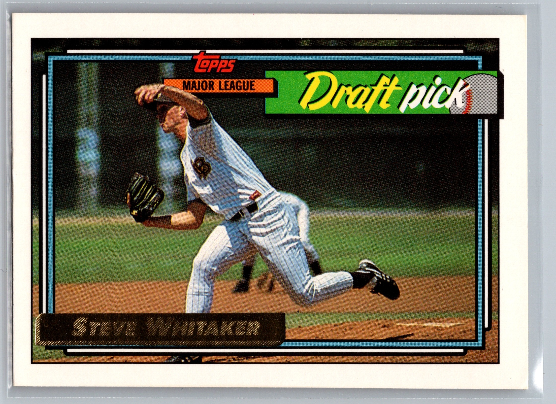 One note that I don’t know how it escaped me all these years, but in the Steve Whitaker Draft Pick 1992 Topps Gold card, the back of the card has “ToppsGold” logo behind the stats. Until I scanned it, I never noticed that at all!